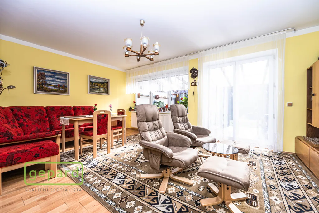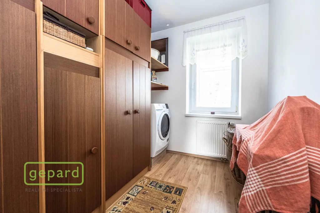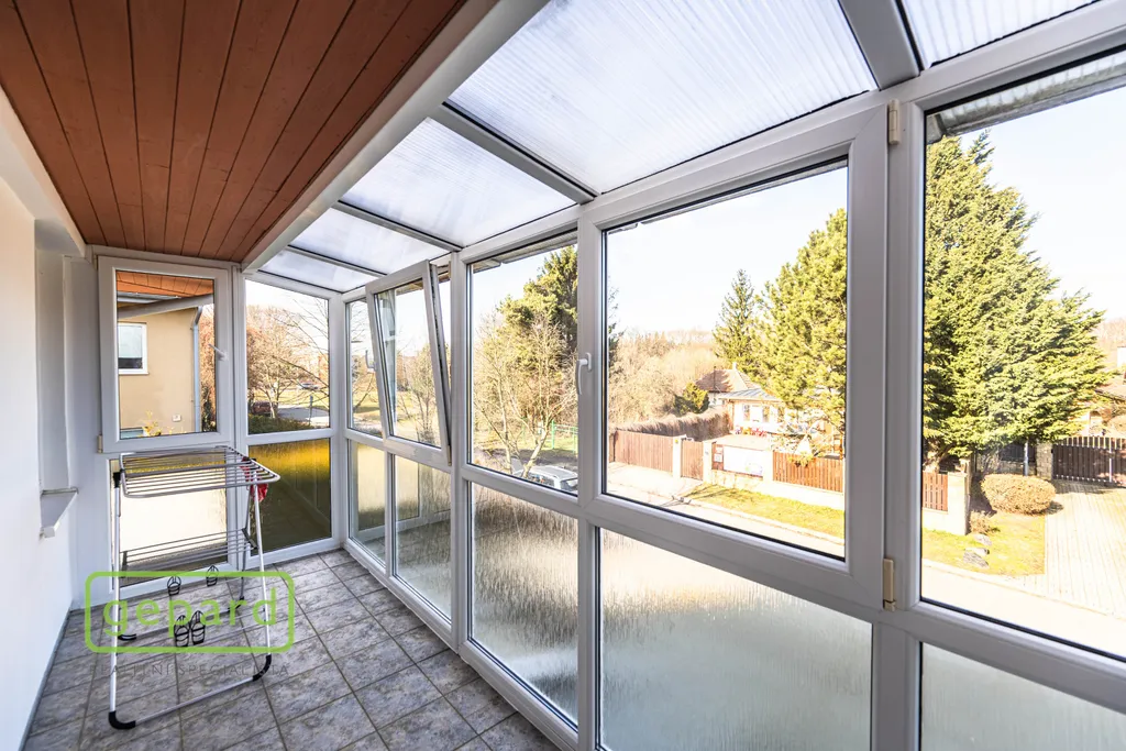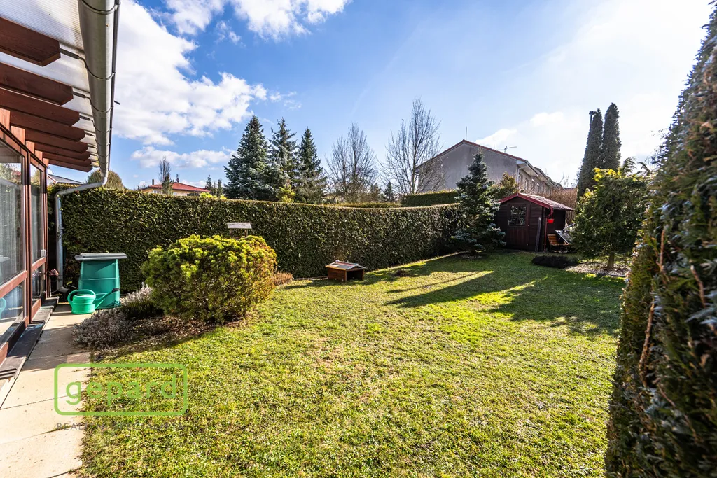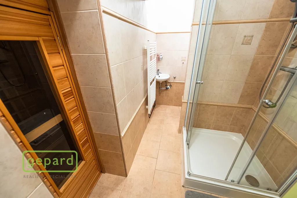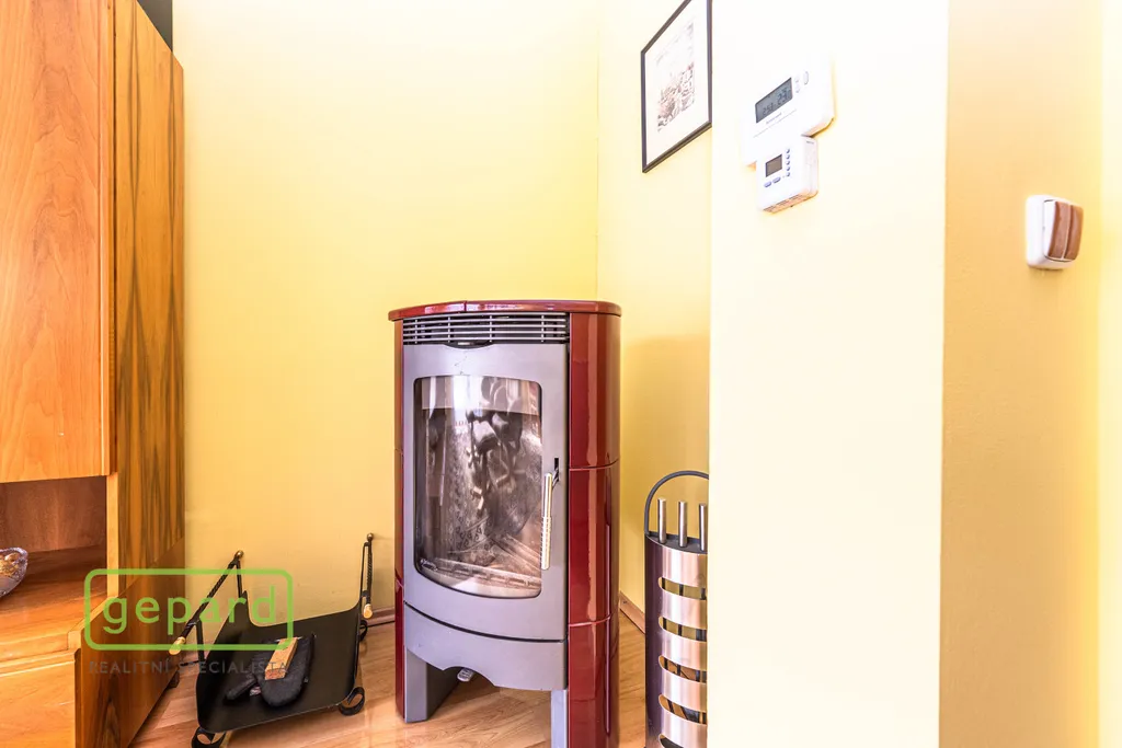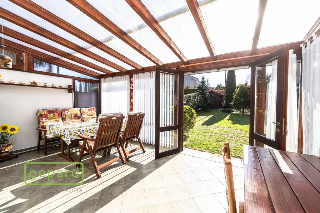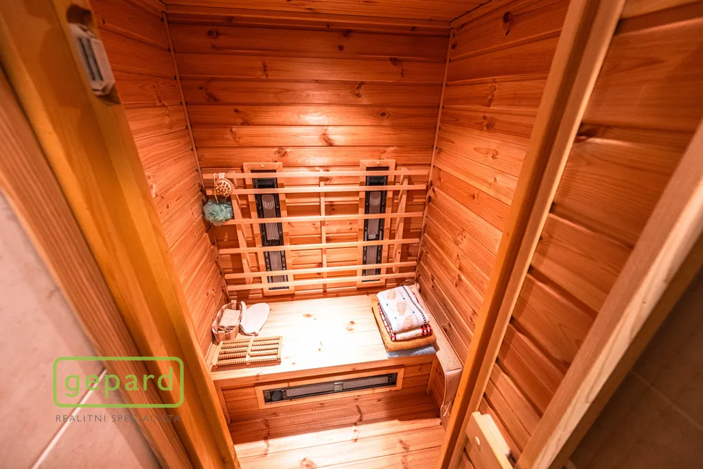 Přízemí: kryté zádveří, předsíň a chodba, koupelna se sprchovým koutem a WC, infrasauna, technická místnost, velký obývací pokoj s kuchyňským koutem, jídelnou a krbovými kamny je propojený s velkou krytou zimní zahradou se vstupem dále na vlastní zahradu. Zimní zahrada je navíc vybavena velkou roztahovací markýzou na el. pohon a celý objekt je chráněn i el. zabezpečením.
