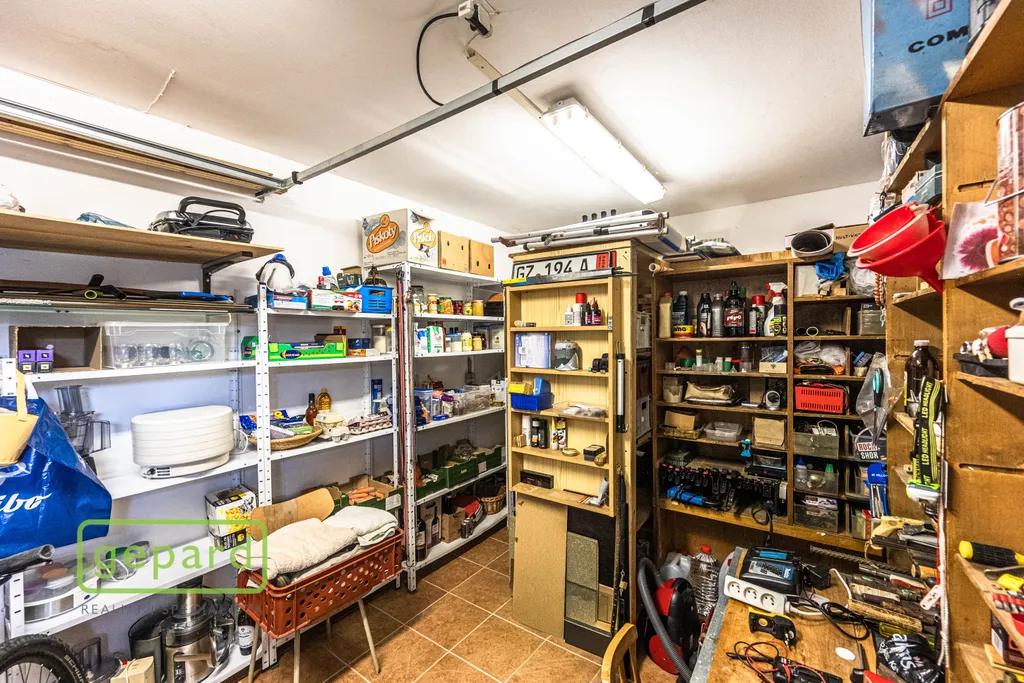 Dále půdní prostor s úložným prostorem a garáž zařízená a využívaná primárně jako sklad a dílna.