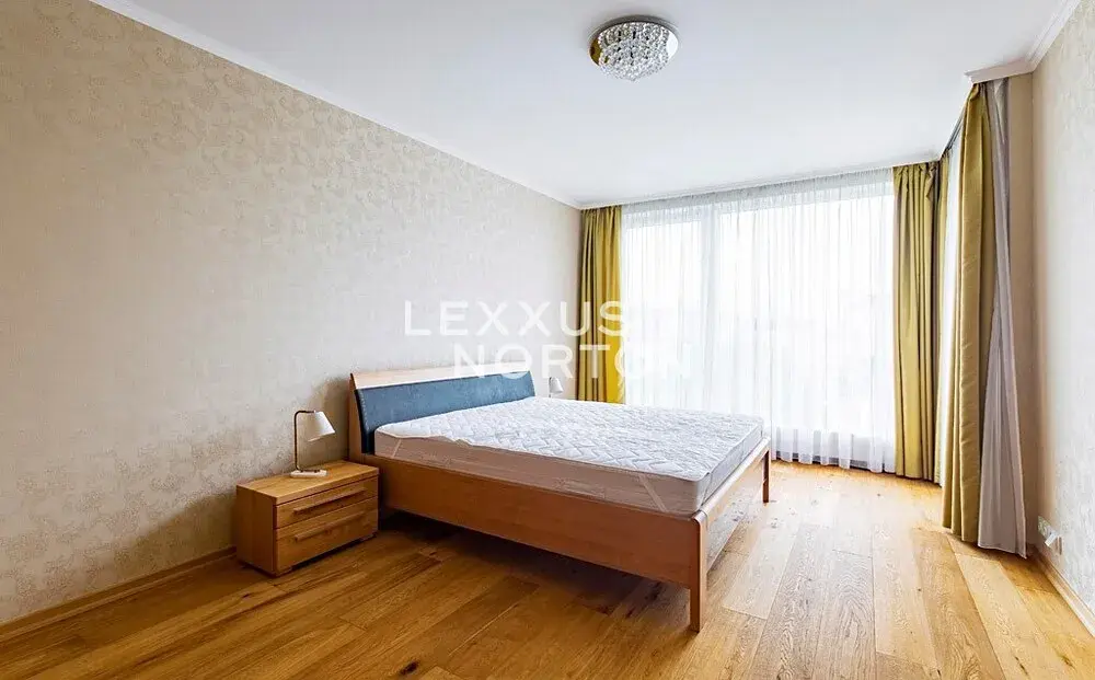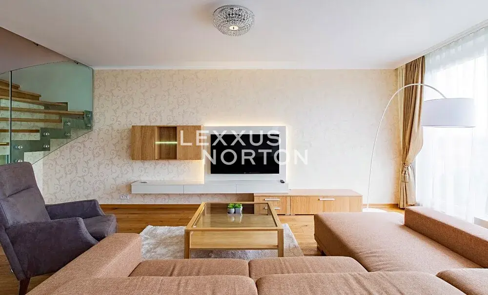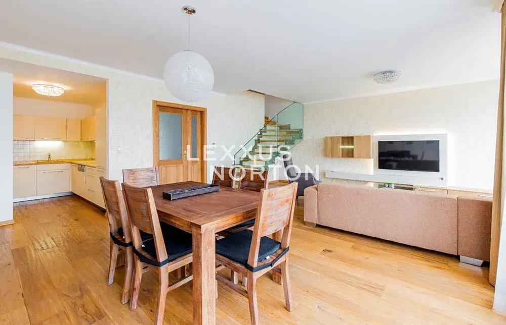Byt disponuje vstupní chodbou, obývacím pokojem s kuchyňským koutem, 2 ložnicemi, šatnou, pracovnou, technickou místností, 2 koupelnami, samostatnou toaletou, balkonem a lodžií. V ceně nájmu jsou zahrnuta dvě garážová parkovací stání.