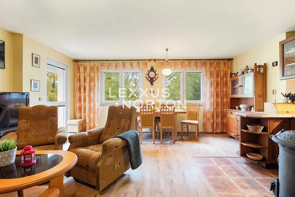 Na pozemku o velikosti 290 m² stojí chata s užitnou plochou cca 100 m², garáž (30 m²) využívaná jako dílna a sklad, a terasa nad garáží o stejné velikosti – ideální místo pro letní stolování nebo klidné ráno s výhledem do zeleně.