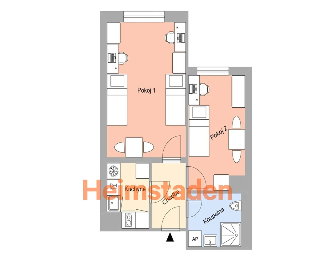 Dispozici tvoří dva samostatné, neprůchozí pokoje. Větší pokoj je vybaven dvěma jednolůžkovými postelemi, menší pokoj jednou jednolůžkovou postelí, což umožňuje komfortní bydlení až pro tři osoby. Samostatná kuchyně je plně zařízená a připravená k okamžitému užívání. Byt se pronajímá kompletně vybavený, takže nabízí možnost rychlého nastěhování bez nutnosti dalších investic.