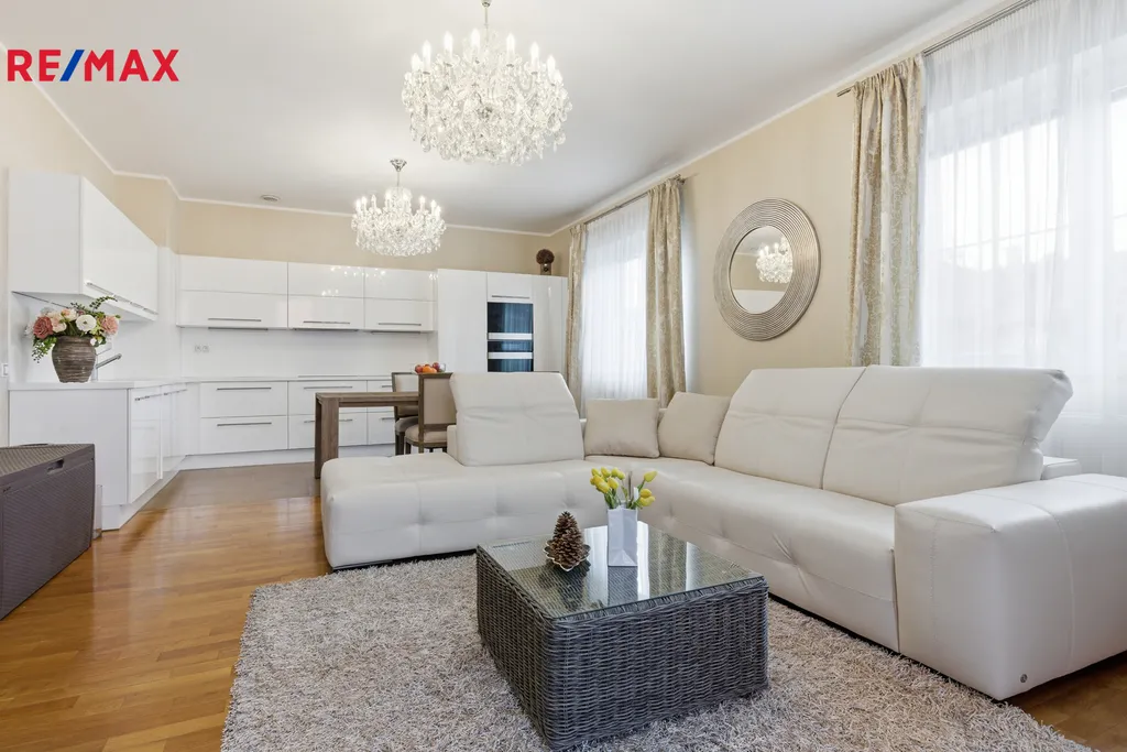 Byt je kompletně vybaven a připraven k okamžitému nastěhování. Interiéru dominují masivní interiérové dveře, kvalitní dřevěné parkety a elegantní křišťálové lustry, které dodávají prostoru nádech luxusu. Kuchyň je vybavena moderními spotřebiči, včetně nové myčky nádobí a nové trouby.