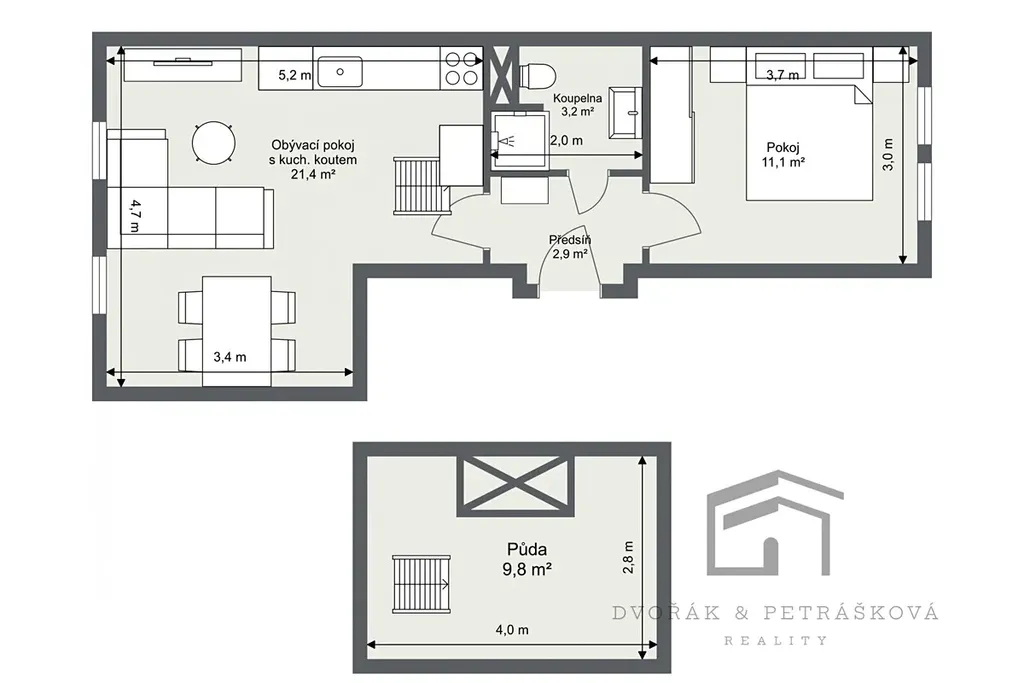 Zrekonstruovaný byt 2+kk 40 m2 (podlahové plochy) s půdním prostorem 10 m2 (užitné plochy), se nachází ve 3.patře cihlového domu BEZ výtahu. Byt prošel rekonstrukcí a je vhodný pro jednotlivce nebo pár. Bytová jednotka disponuje vstupní chodbou s oddělenými vstupy do jednotlivých pokojů. Obývací pokoj s kuchyňským koutem je vybavený myčkou, horkovzdušnou troubou, indukční varnou deskou, digestoří, dostatkem úložného prostoru a samostatně stojící lednicí s mrazákem. Součástí prodeje je i veškerý nábytek na fotografiích. Výška stropu je 2,6 m2. Z obývacího pokoje je přístup na půdu, kterou lze využívat jako úložný prostor - zde jsou nízké stropy a chybí odvětrávání (nelze využívat jako pracovnu).