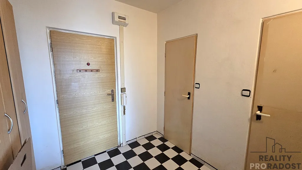Do bytu se vstupuje předsíní(6,9m²) s místem na úložné prostory. Odtud lze pokračovat do koupelny(3m²), na WC(1m²) a pokoje(20,3m²) s kuchyňským koutem. Jádro je zděné. Ve vstupní chodbě, koupelně, toaletě a kuchyňském koutě je keramická dlažba, v pokoji plovoucí laminátová podlaha. Ohřev vody a vytápění je dálkové pro celý dům. Měsíční zálohy placené správě domu vychází na 3.600Kč/Měs (fond oprav, teplo, teplá voda, vodné a stočné, ...)