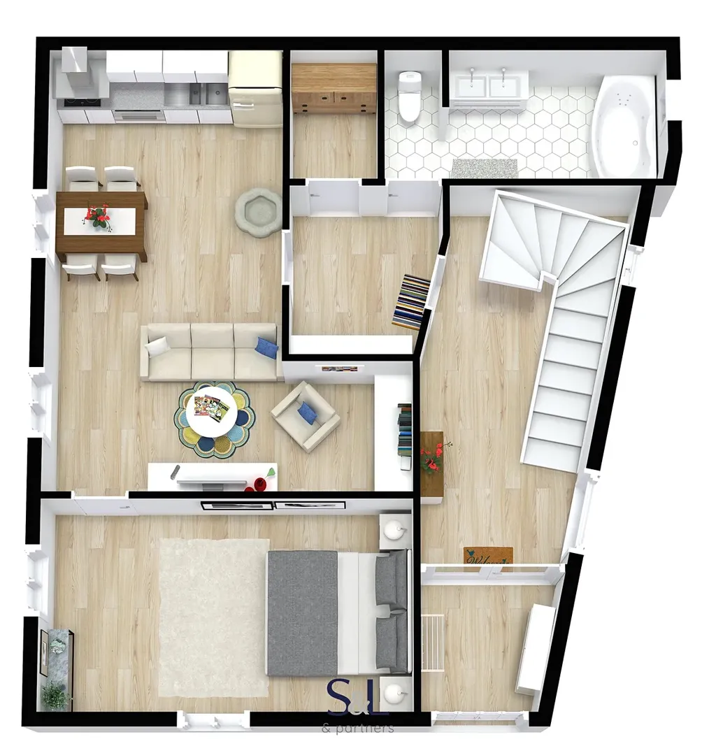 1. patro (90 m² + balkon 3 m²) – bytová jednotka 2+kk s koupelnou a balkonem