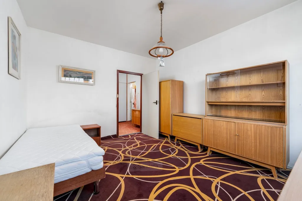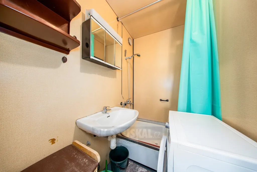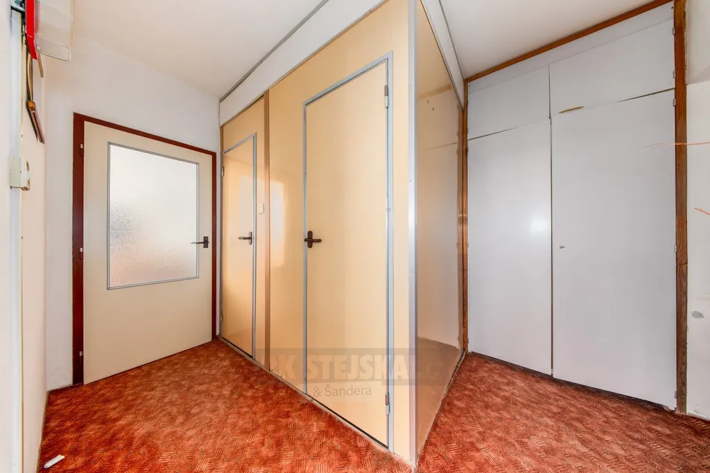 Dispozice: předsíň s předsíňovou stěnou, chodba do L s vestavěnou šatní skříní, původní udržované bytové jádro, samostatná koupelna s menší vanou, umyvadlem a prostorem pro pračku, samostatné WC, samostatná, prostorná ložnice, hlavní obytná místnost s kuchyňskou stěnou, s jídelním prostorem a obývací plochou se vstupem na balkon s otevřeným výhledem, k bytu náleží sklepní kóje a možnost užívání všech společných prostor v domě.