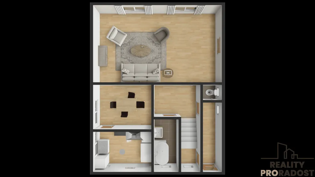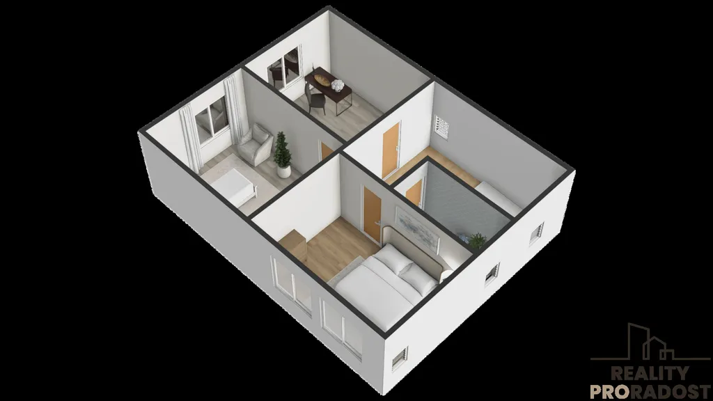 Dům je prakticky dispozičně řešen a poskytuje dostatek prostoru pro pohodlné rodinné bydlení. V přízemí o užitné ploše 59 m² se nachází prostorný obývací pokoj, kuchyně propojená s jídelnou, koupelna, samostatné WC a chodba. Patro, rovněž o užitné ploše 59 m², nabízí tři samostatné pokoje, pracovnu a chodbu, což zajišťuje dostatek soukromí pro všechny členy domácnosti. Součástí domu je také suterén o užitné ploše 54 m², který slouží jako sklepní a technické zázemí domu a poskytuje dostatek úložného prostoru, případně možnost vybudování dílny.