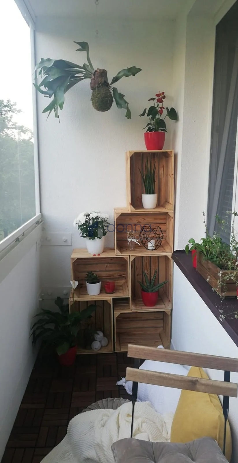 Zasklená lodžie orientovaná do klidné zeleně.