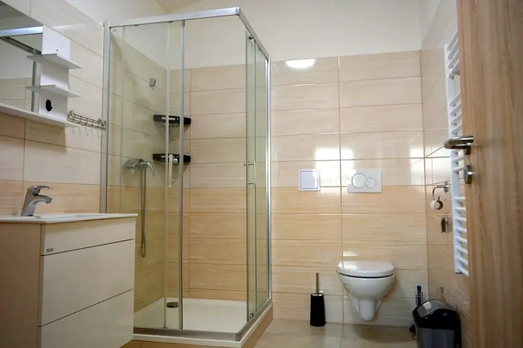 Má vlastní vchod, ze kterého se dostaneme do velkého obývacího pokoje s kuchyňským koutem, který je vybaven kuchyňskou linkou, sporákem, je zde i přívod na myčku. Dále jsou zde 3 pokoje různých velikostí, z nichž je jeden průchozí. V prostorné koupelně se nachází sprchový kout, wc a přívod vody k pračce. V celém bytě je podlahové vytápění, je zde i ústřední topení. Ohřev vody zajišťuje bojler.