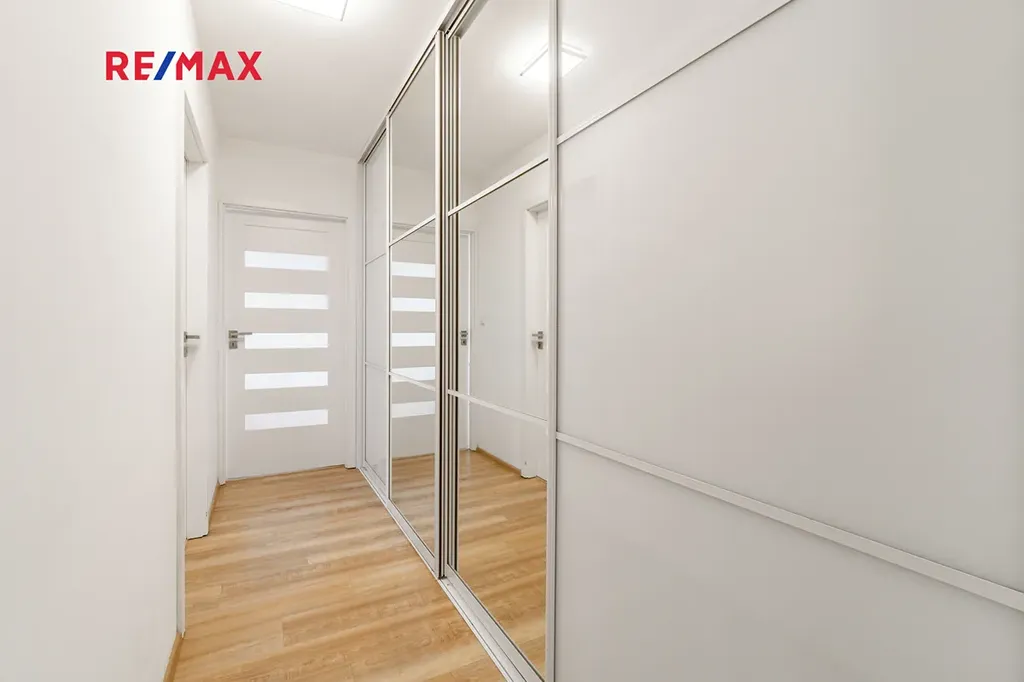 Kuchyňská linka je vybavena vestavnými spotřebiči, a to lednicí, myčkou nádobí, elektrickou troubou a plynovým sporákem. V bytě je také klimatizace, která zajišťuje komfort během letních měsíců. Na chodbě je k dispozici velká vestavěná skříň s dostatkem úložného prostoru.