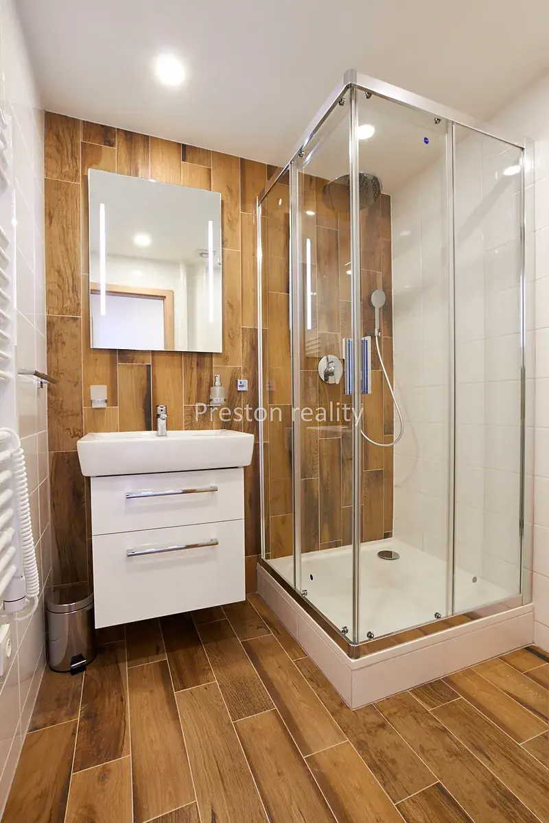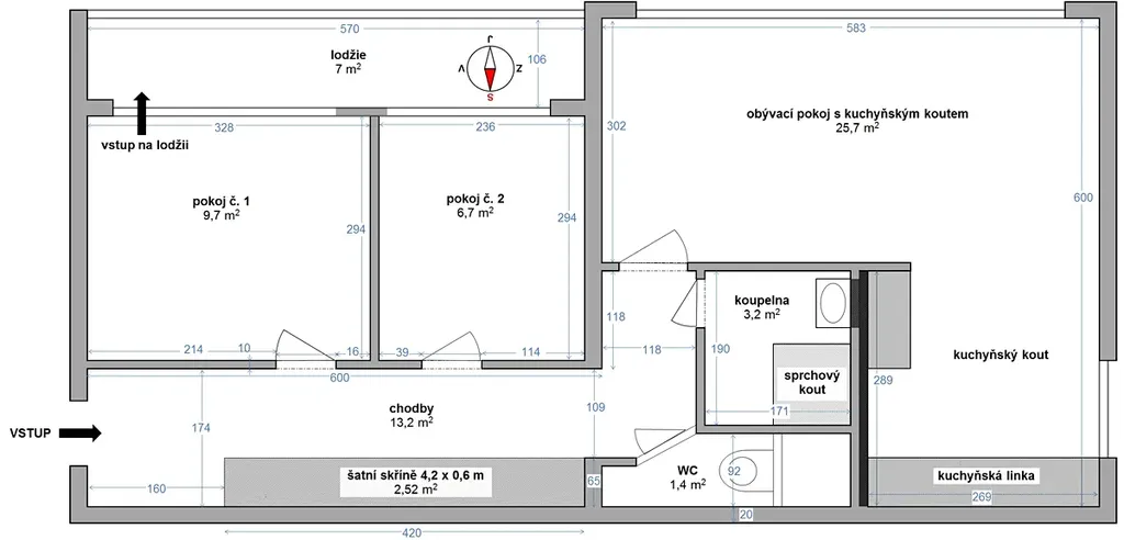 Byt se skládá ze 2 menších pokojů (10 a 7 m2) a obývacího pokoje s kuch. koutem (26 m2). Z většího pokoje je vstup na lodžii, pokoj lze vybavit manželkou postelí s matracemi 180x200 cm. Menší pokoj je vhodný jako pracovna či dětský pokojíček. Obývací pokoj byl propojen s kuchyní, která je vybavená moderní, plně vybavenou kuchyňskou linkou (indukční varná deska, digestoř s filtrem, myčka, el. trouba, mikrovlnná trouba, vestavěná lednice s mrazákem, pračka LG - 6 kg). Koupelna byla zařízena v nadstandardu s obklady značky RAVAK. WC bylo pro větší komfort zvětšeno posunem příčky (viz. plánek), vznikl tak užitečný kout pro odkládání úklidových prostředků. Mísa na WC je ve stylu Rimfree (konstrukce bez skrytých dutých prostor pro snadné čištění). Na chodbě je byt vybaven velkokapacitní skříní se 4 posuvnými dveřmi (2 se zrcadly).
