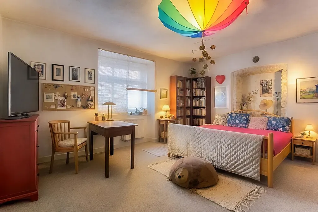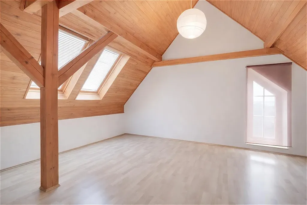 Dvě prostorné místnosti, druhá koupelna a velká centrální chodba s možností dalšího využití (herna, pracovna, relaxační zóna).