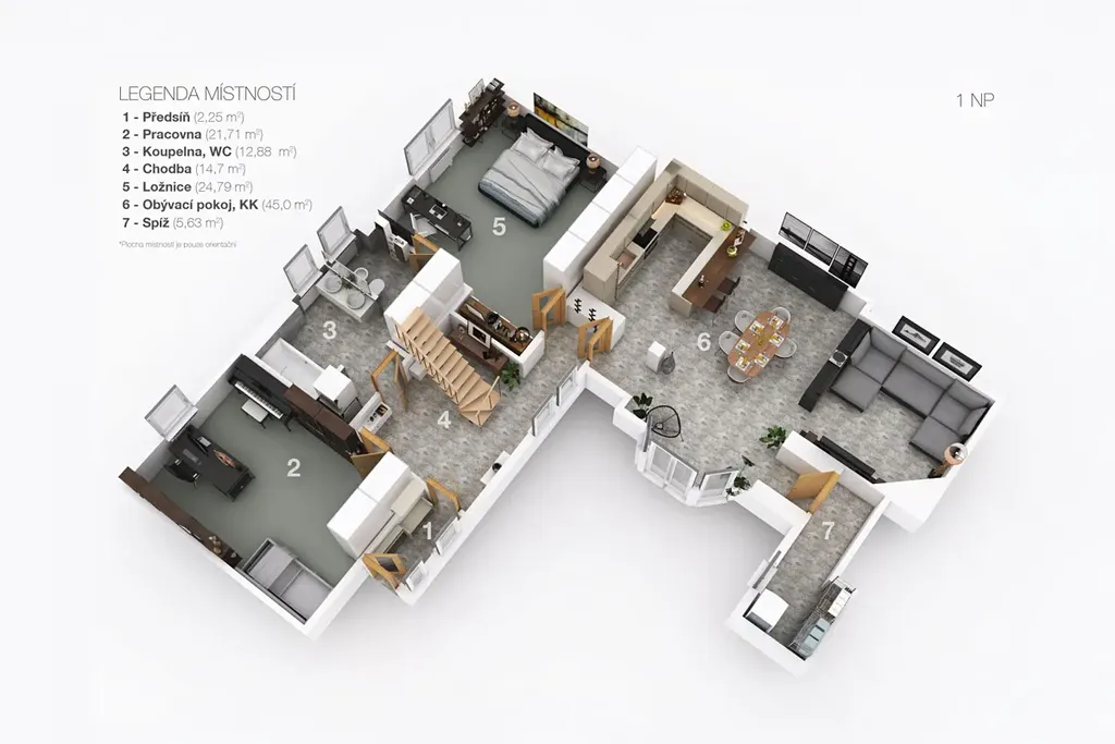 Dále zde naleznete ložnici, pracovnu, koupelnu s WC, spíž a vstupní část s napojením na garáž.