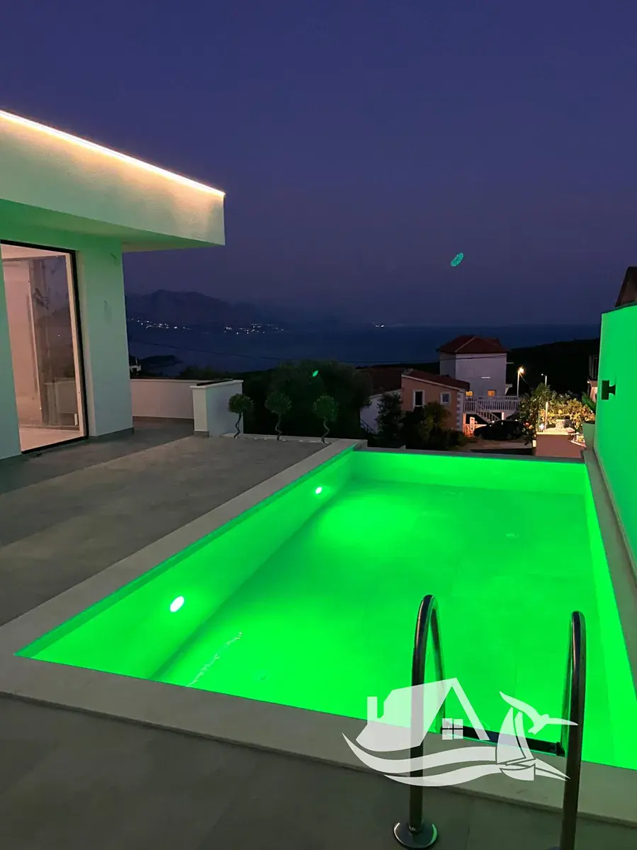 Pozemek o rozloze 250 m² poskytuje dostatek soukromí i prostoru pro relaxaci. K dispozici je terasa s výhledem na moře, upravený dvůr o ploše 60 m² a soukromý bazén o velikosti 18 m², který zpříjemní letní dny i večery strávené s rodinou a přáteli. Moře je vzdálené přibližně 550 metrů, což umožňuje snadnou pěší dostupnost bez nutnosti dojíždění.