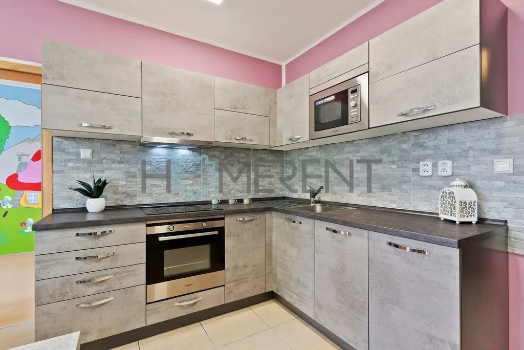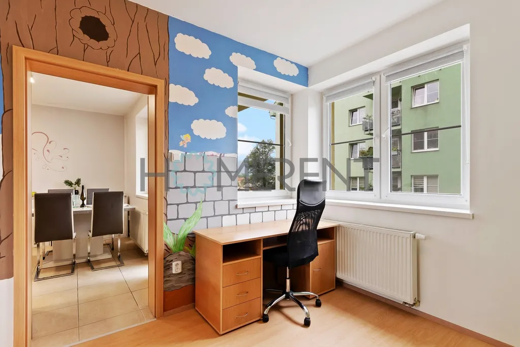 Byt je kompletně zařízený a jeho součástí je kuchyně s jídelním stolem, obývací pokoj, hlavní ložnice, dětský pokoj bez postele, koupelna s vanou a pračkou a samostatné WC. Součástí je i sklepní kóje.