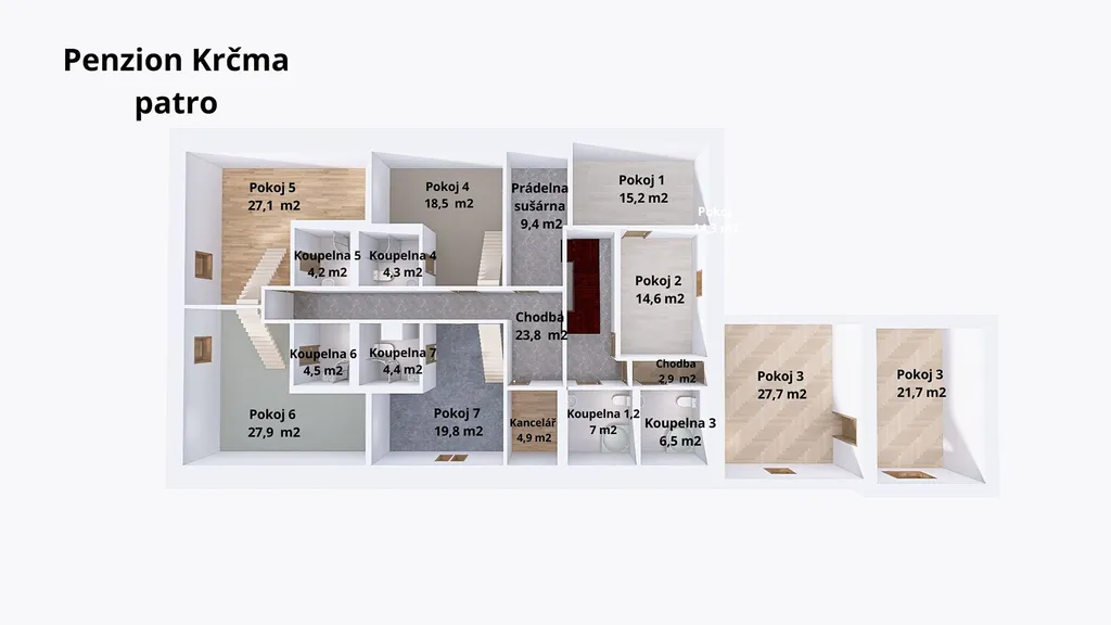 Penzion poskytuje ubytovací kapacitu v apartmánech a pokojích, k dispozici je wellness zóna se saunou a vířivkou. Dále jsou k dispozici dva samostatné byty vhodné pro majitele či personál. Objekt je průběžně rekonstruován, poslední výrazná modernizace proběhla v roce 2021 a je plně provozuschopný bez nutnosti dalších investic.