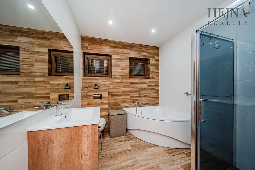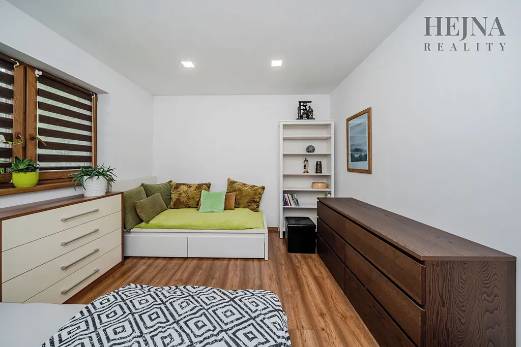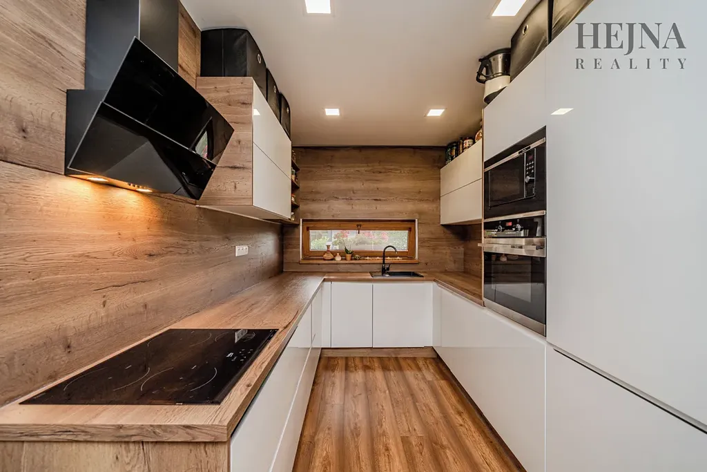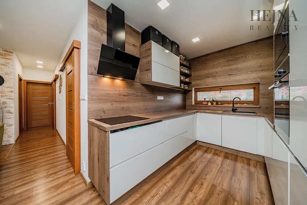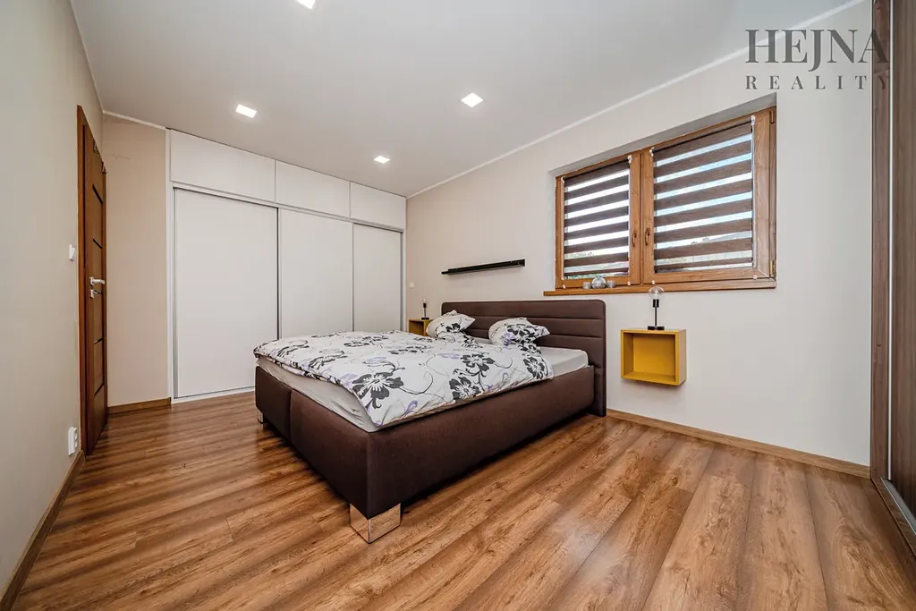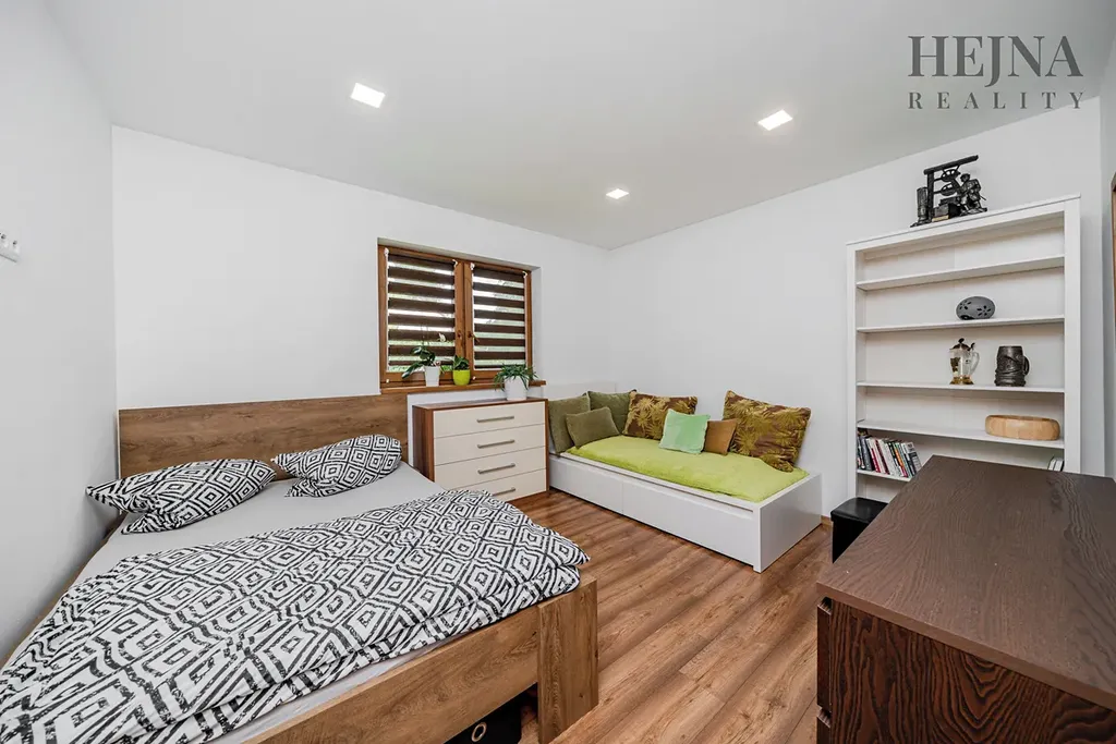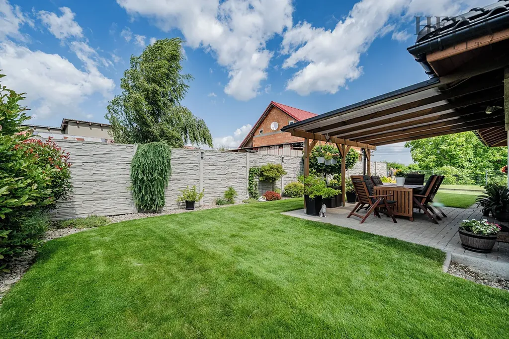 Dispoziční řešení je praktické a nabízí komfortní každodenní užívání. Kuchyňská linka je vyrobena na míru včetně prostoru pro spotřebiče. V chodbě i ložnici jsou vestavné skříně, které poskytují dostatek úložného prostoru. Koupelna je vybavena vanou, sprchovým koutem i WC. Z chodby je vstup do technické místnosti, kde je umístěno technické zázemí včetně prostoru pro kotel. Na obytný prostor navazuje zastřešená terasa, která nabízí příjemné posezení. Vytápění je řešeno kombinací elektrického podlahového topení a krbových kamen, která bez problémů vytopí celý obytný prostor a zároveň vytvářejí příjemnou atmosféru. Konstrukčně je dům zděný z cihelných bloků Heluz tl. 240 mm a zateplený kontaktním fasádním systémem s izolantem EPS 70 o tloušťce 200 mm. Okna jsou plastová, šestikomorová, s izolačním trojsklem. Střecha je valbová se sklonem 25°, konstrukčně řešená jako dřevěný krov. Dům je napojen na veřejný vodovod, odpad je řešen septikem s vývozem. Dešťová voda je svedena do vrtu. Pozemek je celooplocen, což zajišťuje dostatek soukromí i bezpečí. Součástí exteriéru je přístřešek pro 2 až 3 automobily a zahradní domek určený k uskladnění nářadí a zahradního vybavení. Zahrada je pečlivě udržovaná, osázena okrasnými stromy a keři, prakticky členěná a nenáročná na údržbu.