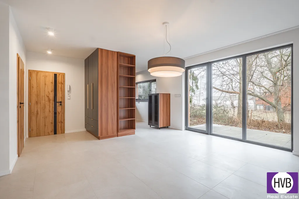 V přízemí se nachází prostorný a světlý obývací pokoj s přímým vstupem na terasu a zahradu, plně vybavený kuchyňský kout (varná deska, digestoř, myčka, lednice), koupelna se sprchovým koutem a WC, technická místnost a praktické úložné prostory.