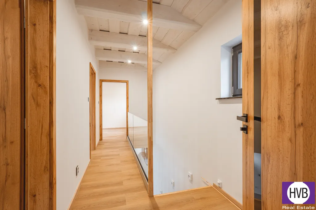 V patře je hlavní ložnice, dva další samostatné pokoje vhodné jako dětské pokoje či pracovna a druhá koupelna s vanou, sprchovým koutem a WC.
