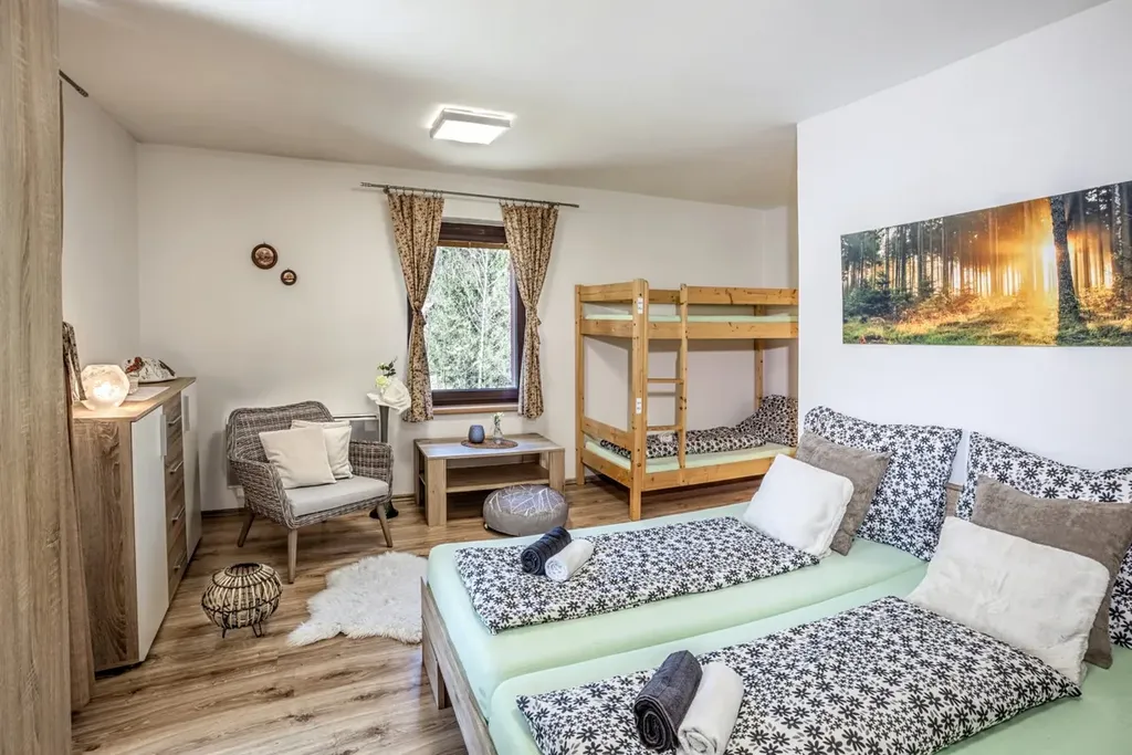 Nemovitost momentálně využívána jako zavedený Penzion KAROLINKA. Bez nutnosti jakýchkoli úprav možno ihned využívat jako jednogenerační rodinný dům. Po drobných úpravách možno předělat na 2generační bydlení o 2 prostorných bytových jednotkách.