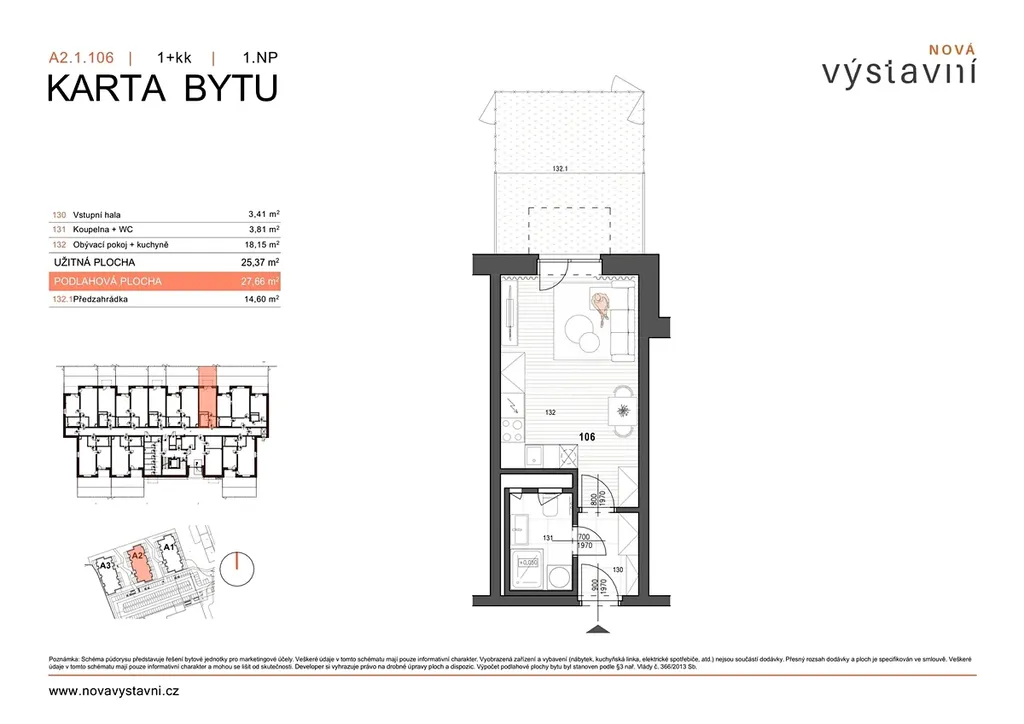 • Dispozice 1+kk s podlahovou plochou 27,66 m2