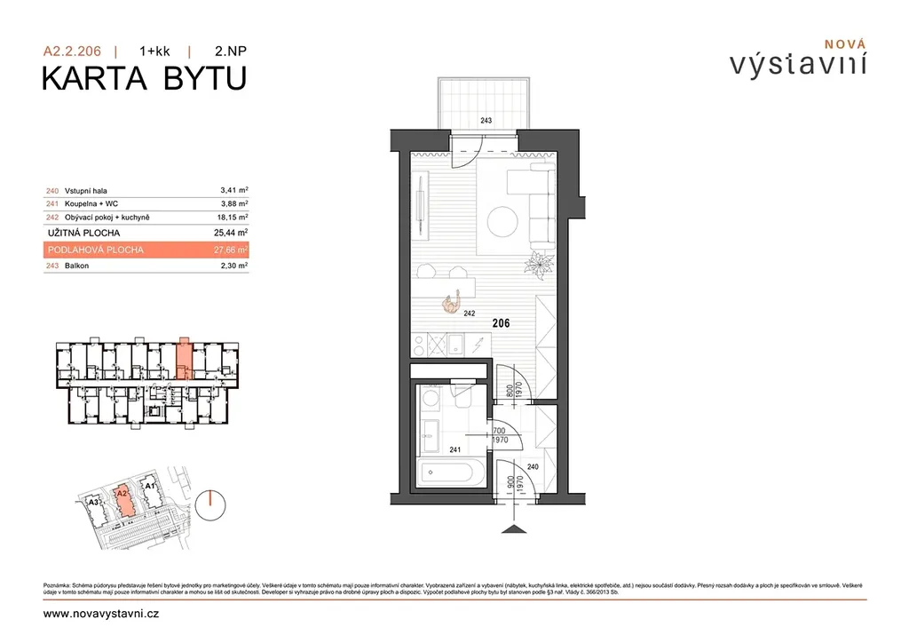 • Dispozice 1+kk s podlahovou plochou 27,66 m2