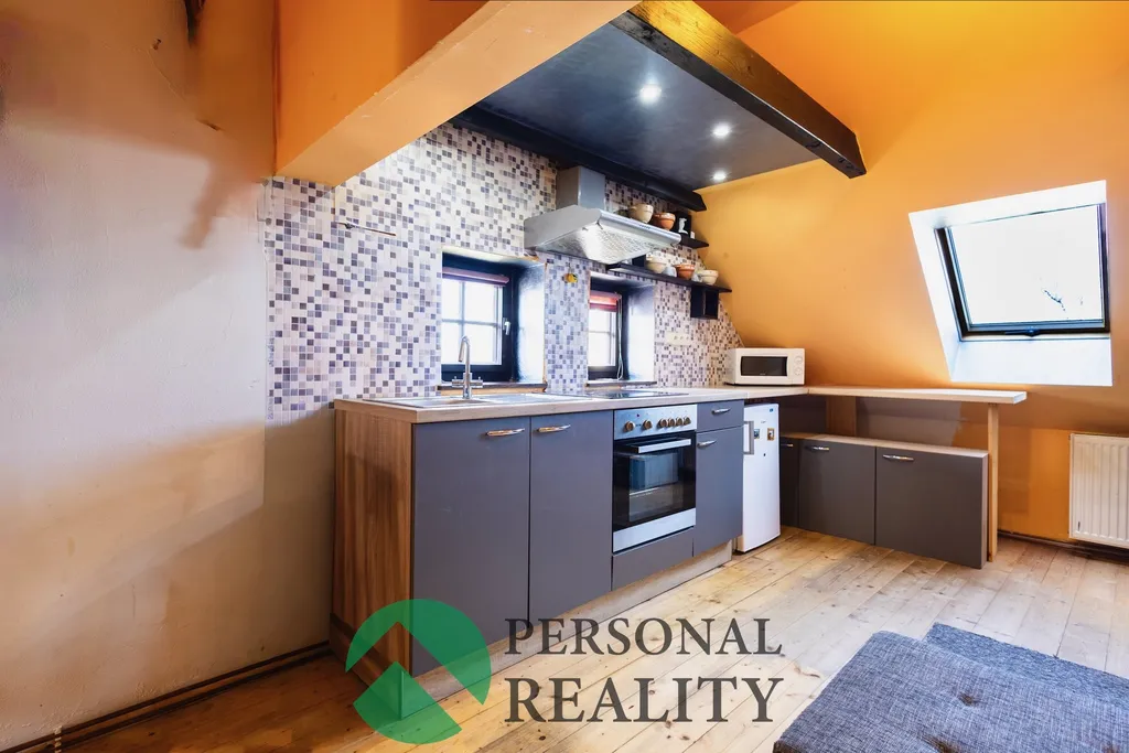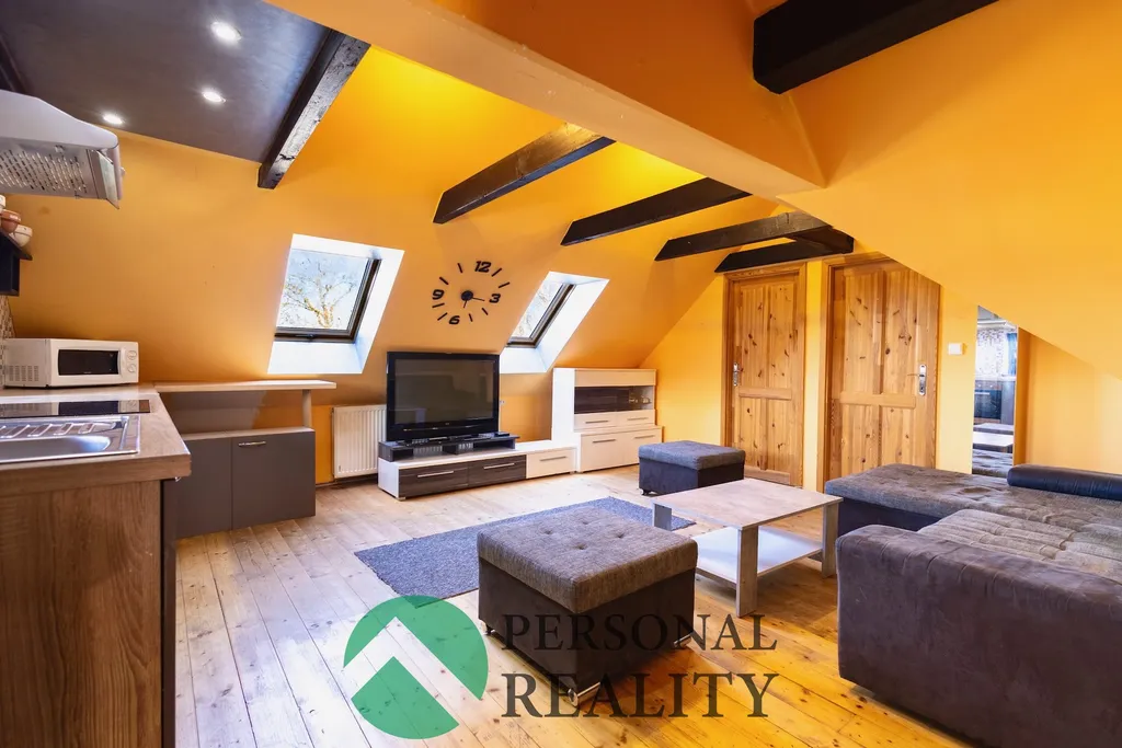 Druhá bytová jednotka (dispozice 3+kk) je v podkroví, kam vás ze zádveří zavede dřevěné schodiště. Po levé straně najdete koupelnu s rohovou vanou a toaletou a s přípojkou pro pračku. Dále vejdete do velkého obývacího pokoje s kuchyní, na kterou navazují vstupy do 2 podkrovních pokojů a jedné místnosti vhodné třeba pro šatnu či pracovnu.