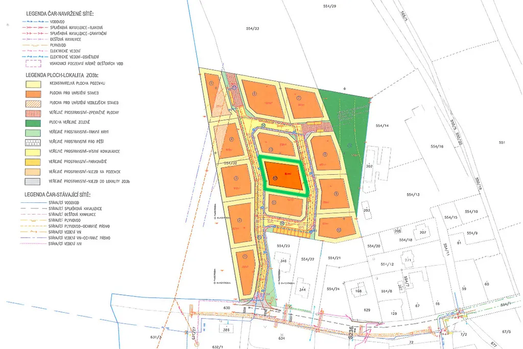 Dle ÚP je zde schválena částečně uspořádaná zástavba, výška zástavby max. 1+P (podmínečně 2+P), aktuálně je již uhrazena projektová dokumentace pro inženýrské sítě (vodovod, kanalizace, plynovod, elektřina, příjezdové cesty, osvětlení), samotná realizace sítí i cest bude v režii kupujícího, k dispozici je podrobná územní studie (možno poskytnout), probíhá výběr zhotovitele pro realizaci kompletních sítí v rámci všech parcel.