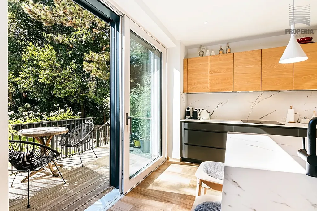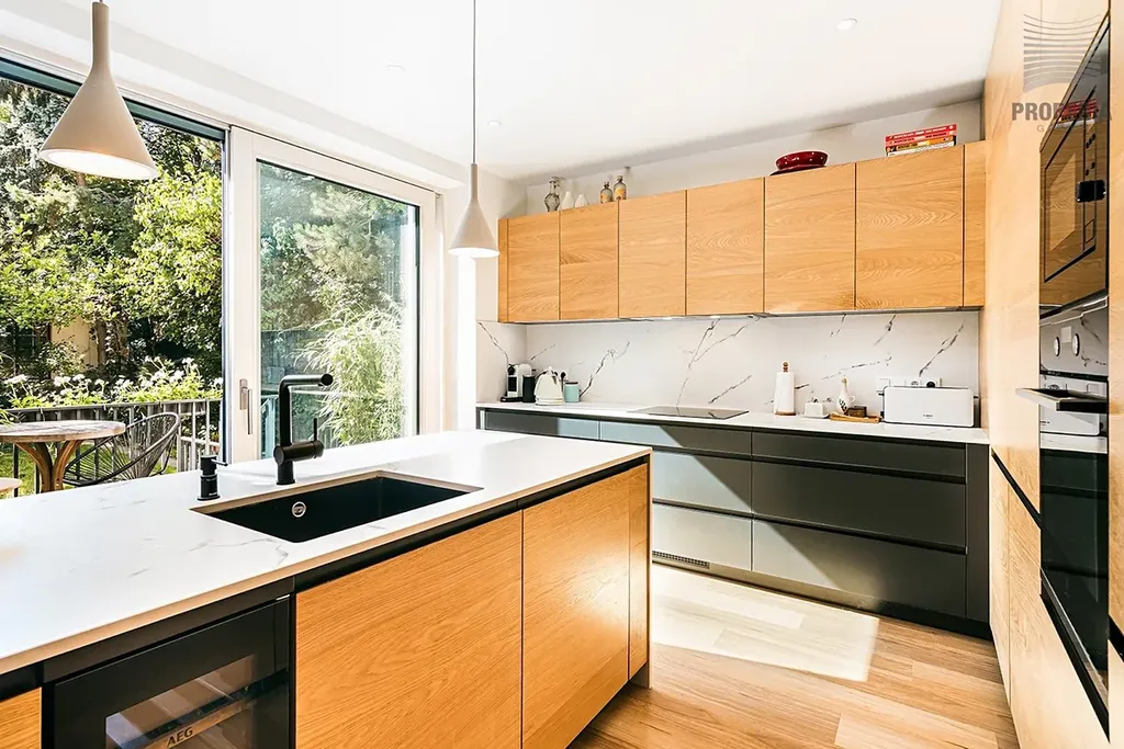 Většina obytných místností, obývací pokoj i terasa jsou orientovány na jih, díky čemuž je dům celý den prosvětlený a působí nesmírně vzdušně a útulně. Interiér byl zcela nově vybudován v jednotném moderním stylu s důrazem na detail, nadčasovost a kvalitní materiály. Dominantou domu je prostorná kuchyně Hanák s ostrovem, vestavnými spotřebiči a přímým vstupem na terasu do zahrady.