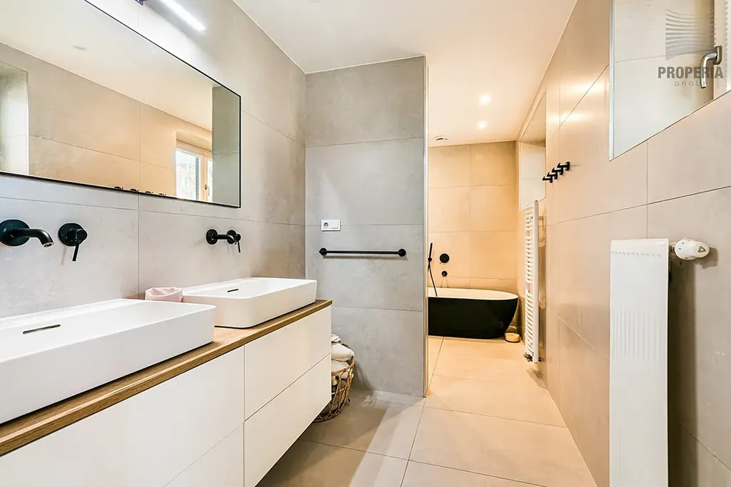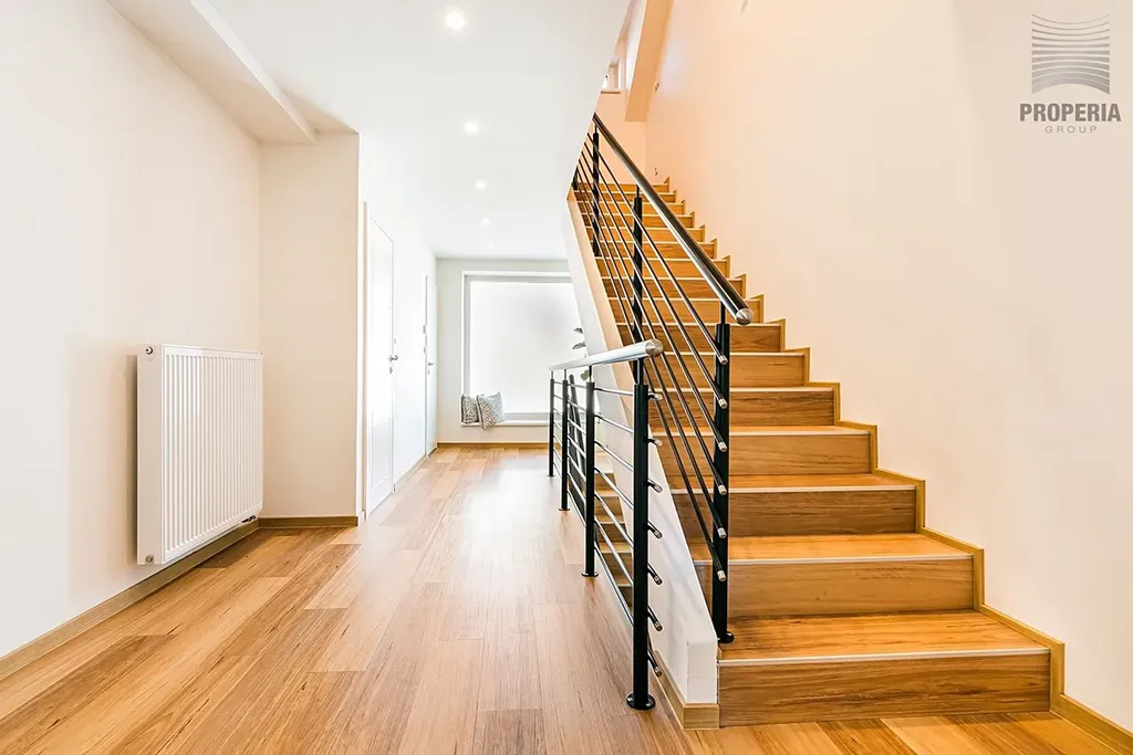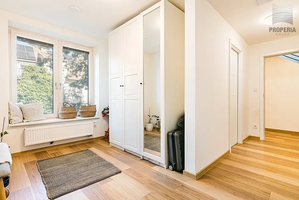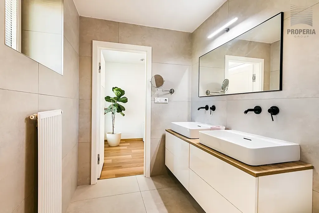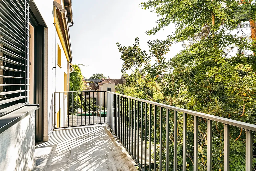 Dispozice 7 + kk zahrnuje velkorysý obývací prostor s jídelnou a kuchyní, pět ložnic, pracovnu v suterénu, dvě koupelny a tři samostatné toalety. V domě byla provedena kompletní rekonstrukce – nová střecha, fasáda, rozvody elektřiny, vody, odpadů i topení, dále zateplení, nové podlahy ve všech patrech, omítky, obklady, sanita, dveře a osvětlení. Použitá okna jsou dřevohliníková – zvenčí odolný hliník, zevnitř přírodní dřevo – a jsou vybavena elektricky ovládanými předokenními žaluziemi ve všech místnostech.