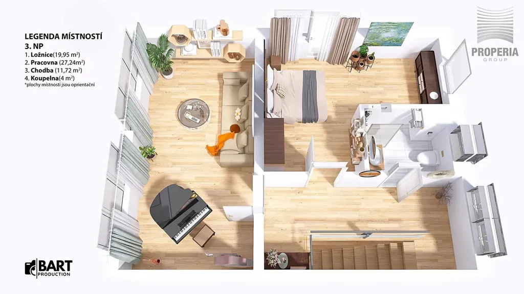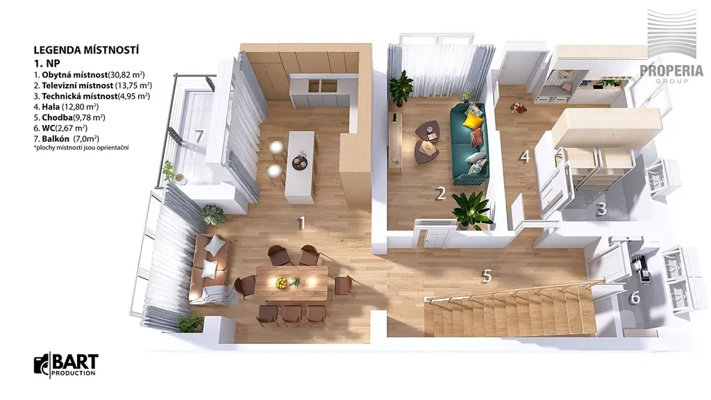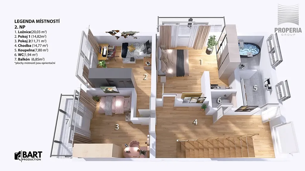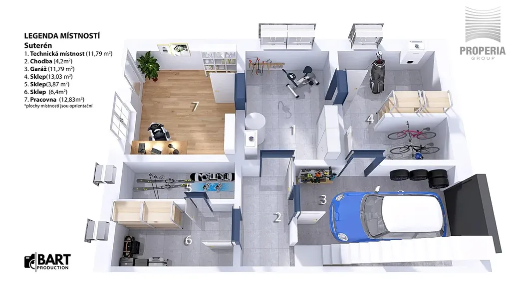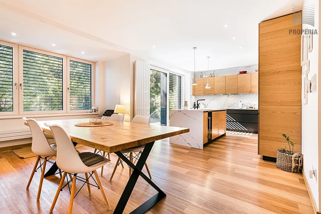 Dispozice 7 + kk zahrnuje velkorysý obývací prostor s jídelnou a kuchyní, pět ložnic, pracovnu v suterénu, dvě koupelny a tři samostatné toalety. V domě byla provedena kompletní rekonstrukce – nová střecha, fasáda, rozvody elektřiny, vody, odpadů i topení, dále zateplení, nové podlahy ve všech patrech, omítky, obklady, sanita, dveře a osvětlení. Použitá okna jsou dřevohliníková – zvenčí odolný hliník, zevnitř přírodní dřevo – a jsou vybavena elektricky ovládanými předokenními žaluziemi ve všech místnostech.