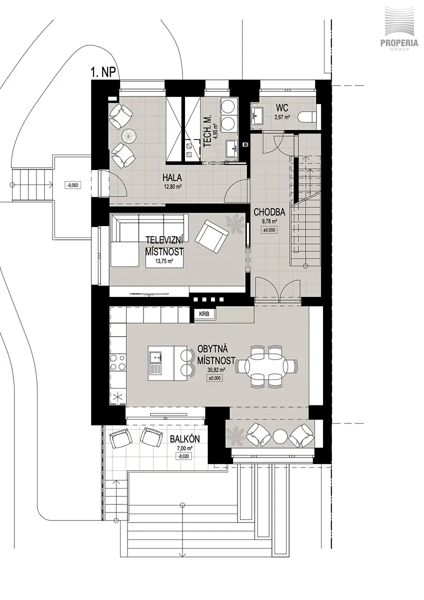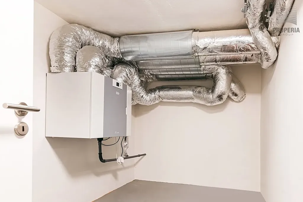 Komfort zajišťuje rekuperační jednotka Brinks 400, která přivádí čerstvý vzduch do celého domu, a plynový kotel se zásobníkem TUV pro úsporný ohřev vody a vytápění. Bezpečnost domu zajišťuje kamerový systém a alarm Jablotron.