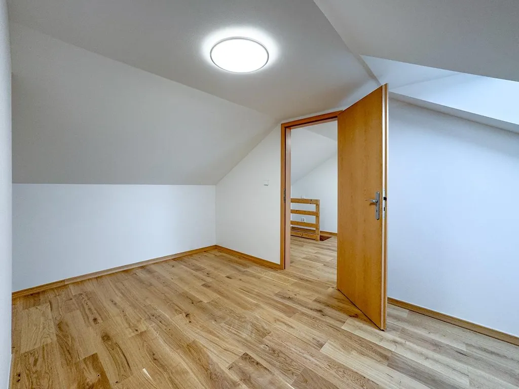 Nově zrekonstruovaný, kuchyňským koutem vybavený byt, může být již brzy Vaším domovem. Mezonetový byt má atypickou dispozici 3+kk, 53m2 a k dispozici je také parkovací stání č. 13. Vstup do bytu je přes schodiště v 2.NP ze zadní části domu. První patro bytu se skládá ze zádveří , spotřebiči vybaveného kuchyňského koutu s obývacím pokojem, koupelny se sprchovým koutem a wc. Do horního patra pak vede z chodby dřevěné mlynářské schodiště a nahoře je menší místnost u schodiště a samostatná ložnice.