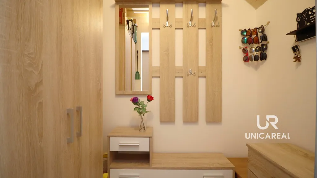 • Ze vstupní chodby je vpravo ložnice, vlevo kuchyňský kout propojený s obývacím pokojem, ze kterého je vstup na prosluněnou lodžii.