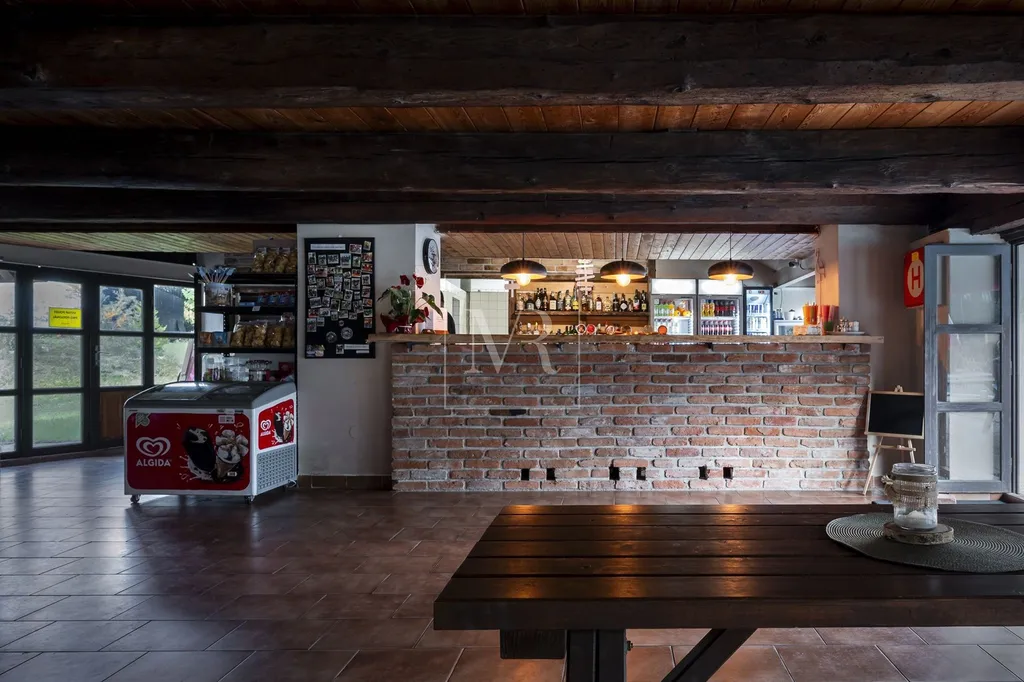 Centrem Resortu je prostorná restaurace s výčepem a plnohodnotnou kvalitně vybavenou kuchyní, kde lze připravit kompletní stravování pro hosty. Nacházejí se zde také skladovací prostory, prádelna a dvě kanceláře. Kemp disponuje dvěma pódii, ideálními pro kulturní zábavu a venkovní programy. V areálu se nachází velký bazén 20x10m, který poskytuje osvěžení a zábavu v letních měsících. Samozřejmostí je potom velký prostor před areálem pro parkování vozidel návštěvníků a zahrada pro pěstování vlastních plodin.
