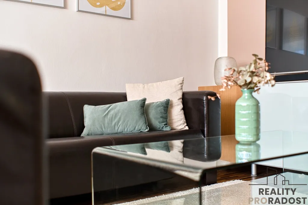 Byt bude částečně vybaven. Zůstává jídelní stůl v kuchyni se židlemi, šatní skříně v pokoji, skříňky pod televizí, zrcadlo a botník v předsíni.