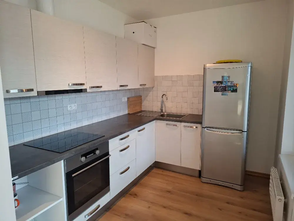 Celý byt s velkými okny a vstupem na prostornou terasu je orientován na západ. Součástí ceny je plně funkční a vybavená kuchyně včetně spotřebičů (sklokeramická varná deska, el. trouba, digestoř), v předsíni je dále umístěna skříň s botníkem, objednaná na míru, přičemž v levé části předsíně (chodby) je ještě nevyužitý volný prostor, vhodný k finalizaci, dle potřeb kupujícího. Samostatná neprůchozí ložnice se vstupem z předsíně a výhledem z okna na terasu. Koupelna s vanou a s prostorem pro umístění pračky a s WC. Na oknech záclony a závěsy.