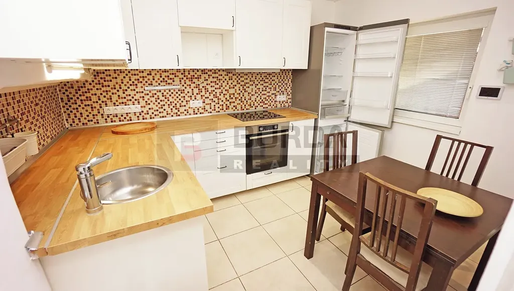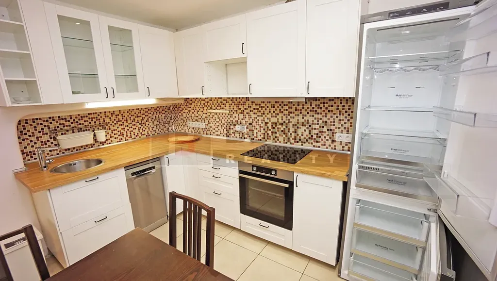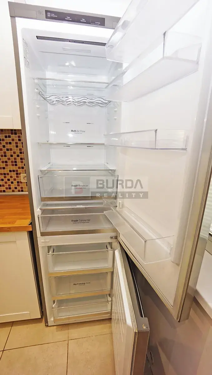 V kuchyni je k dispozici plně zařízená kuchyňská linka s el. troubou, indukční varnou deskou, lednicí s mrazákem LG a myčkou Bosch.