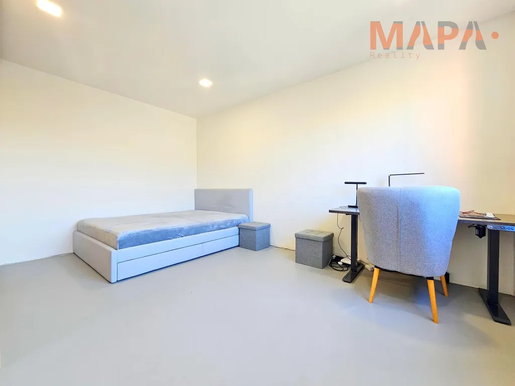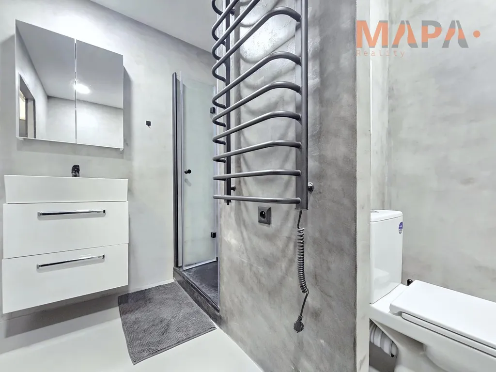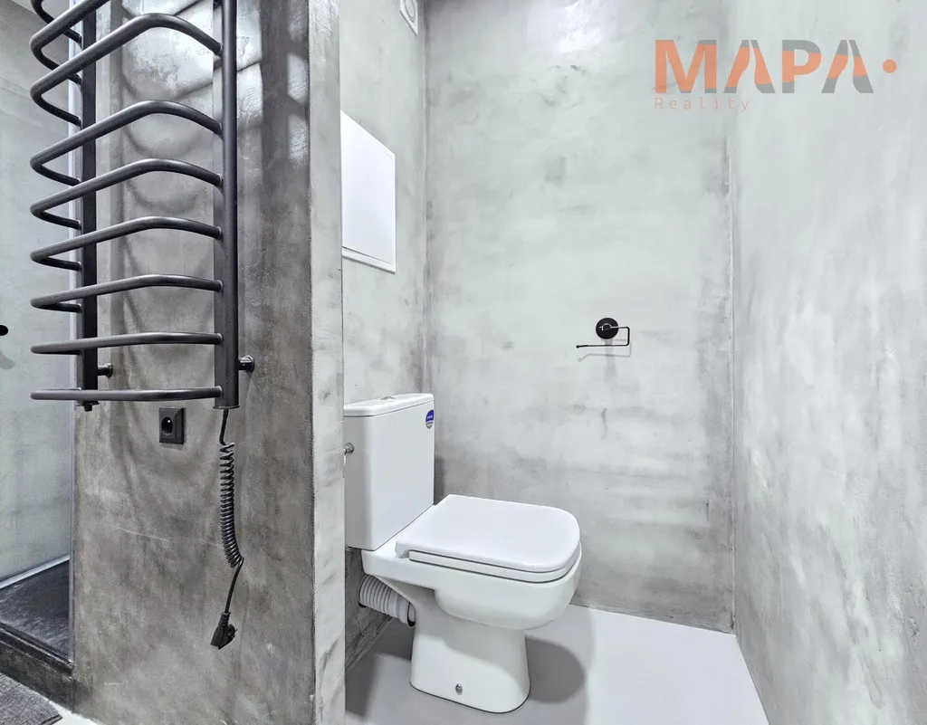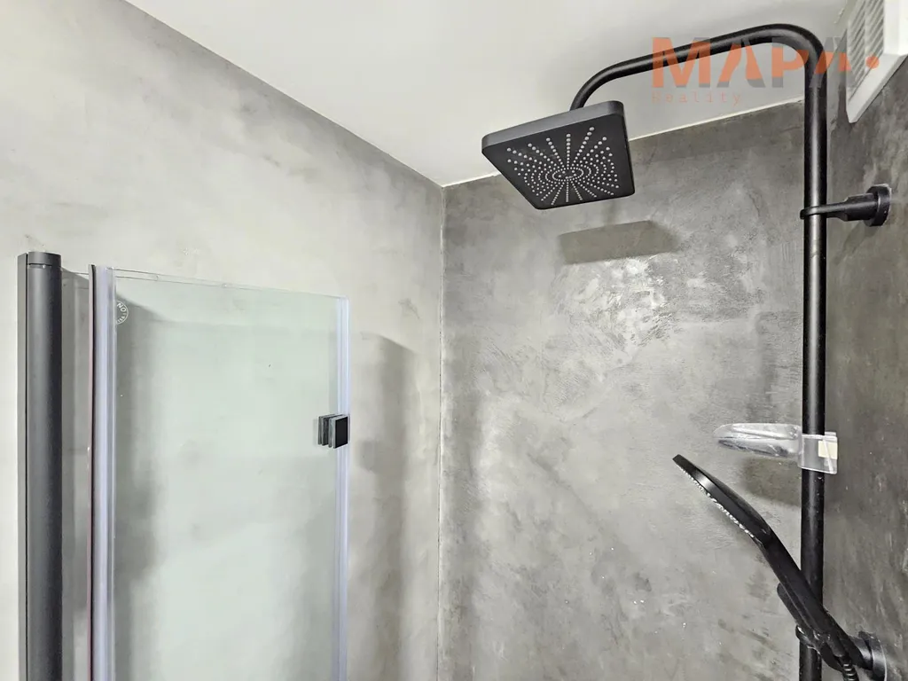 Interiér bytu působí moderně a čistě. Dominantou je nová epoxidová podlaha, která dodává prostoru elegantní vzhled a zároveň je velmi praktická na údržbu. V koupelně a částečně také v kuchyni jsou použity moderní betonové stěrky, které podtrhují současný styl bydlení.