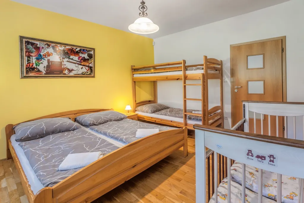 Rodinný dům: předsíň, toaleta, chodba, tři neprůchozí pokoje, koupelna (s rohovou vanou, sprchovým koutem i WC), prostorný obývací pokoj s jídelnou, kuchyň a terasa.