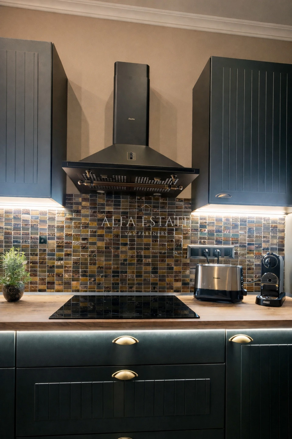 Dominantou bytu je reprezentativní obytný prostor s kuchyňským koutem, kde se snoubí funkčnost s elegancí. Kuchyňská linka vyrobená na míru je vybavena kompletní sadou spotřebičů značky Gorenje a přirozeně navazuje na obývací část, která vytváří příjemné prostředí pro odpočinek i společenské chvíle.