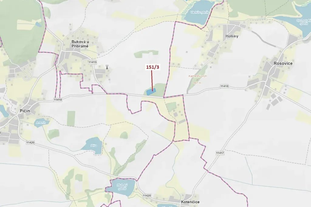 Lesní pozemek o výměře 9 307 m2, parcelní číslo 151/3, podíl 1/1, katastrální území Buková u Příbramě, obec Buková u Příbramě, obec s rozšířenou působností Příbram, okres Příbram, Středočeský kraj. Po těžbě.