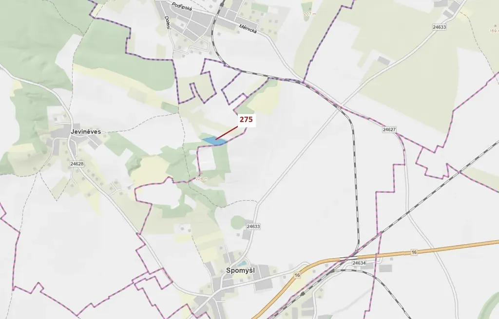 Lesní pozemek o výměře 10 319 m2, parcelní číslo 275, podíl 1/1, katastrální území Jeviněves, obec Jeviněves, obec s rozšířenou působností Mělník, okres Mělník, Středočeský kraj. Po těžbě.