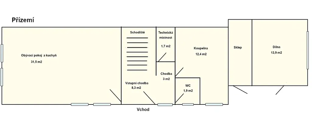 V přízemí se nachází obývací pokoj spojený s kuchyňským koutem, koupelna, WC a technická místnost. V 1. patře je společenská místnost, ložnice, 2 menší dětské pokoje a toaleta. K domu přiléhá zděný přístavek, sloužící jako dílna a kolovna. Pod přístavkem najdeme malý sklípek o velikosti cca 6 m2.