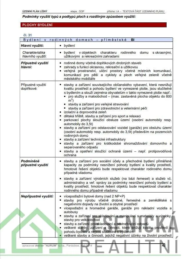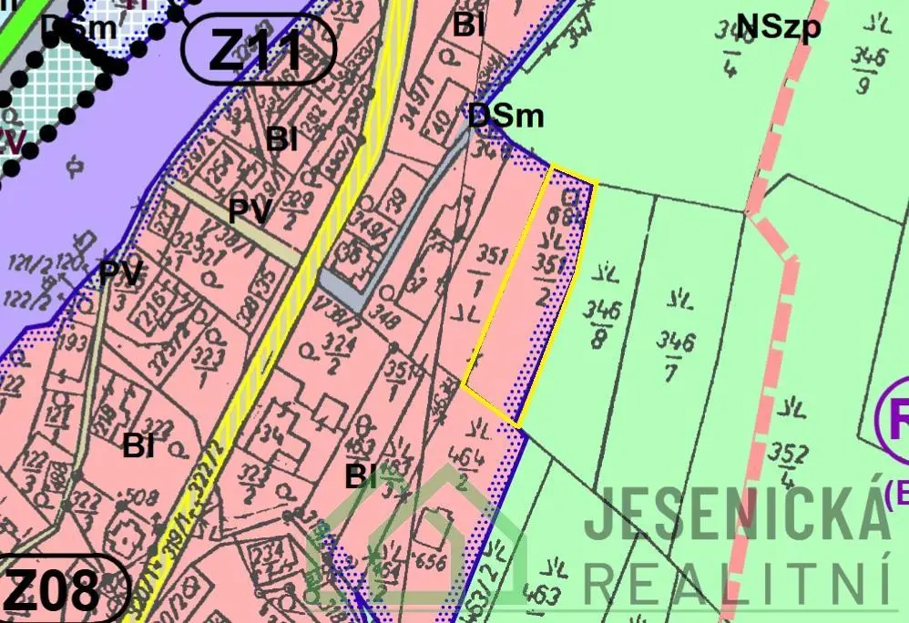 V územním plánu se pozemek nachází v oblasti BI - bydlení v rodinných domech, bydlení v objektech charakteru rodinného domu s okrasnými užitkovými a rekreačními zahradami. Přístup k pozemku je jenom po pěší stezce, která prochází přes okolní pozemky.