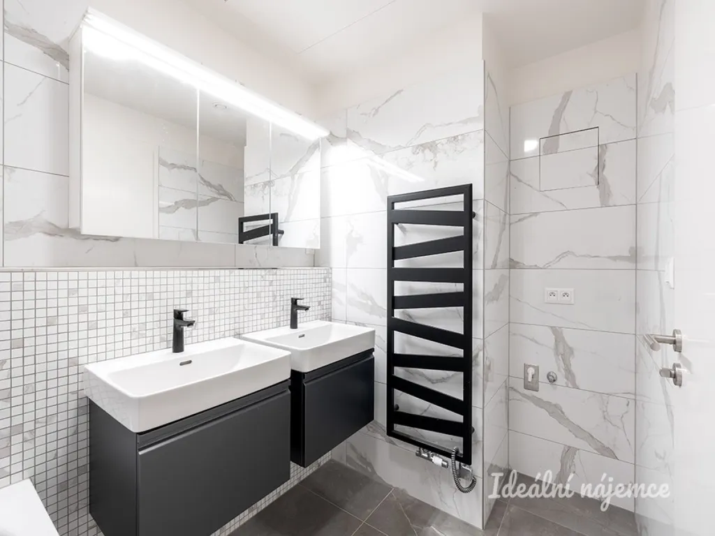 Po vstupu do bytu najdeme v předsíni vestavěnou šatní skříň. Následně se po pravé straně nachází dvě ložnice se shodnou velikostí 13m2, obě s vestavěnou šatní skříní a samostatným vstupem na terasu. Koupelna nabízí dvě umyvadla se skříňkou a prostornou vanu. Toaleta je umístěná samostatně.