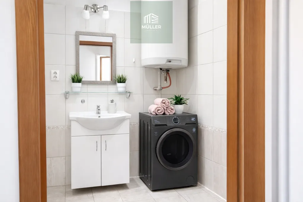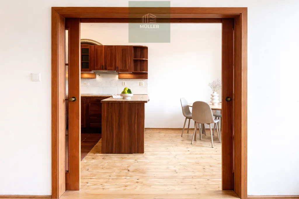 Byt zaujme především příjemnou atmosférou a zajímavou dispozicí, která nabízí velkorysé rozměry jednotlivých pokojů. Dominantou bytu je kuchyně propojená s jídelním koutem, která navazuje na obývací pokoj. Z něj je vstup do dalšího samostatného pokoje, což vytváří praktické a zároveň útulné uspořádání prostoru.
