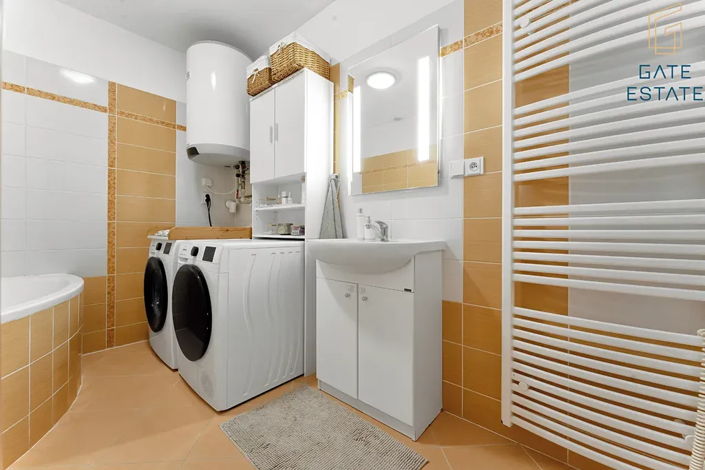 Po vstupu do bytu vás přivítá prostorná chodba, která propojuje jednotlivé místnosti. Dominantou bytu je klimatizovaný obývací pokoj propojený s kuchyňským koutem. Kuchyně je vybavena vestavěnými spotřebiči, nabízí velkou pracovní plochu i dostatek skříněk, což ocení každý, kdo rád vaří.