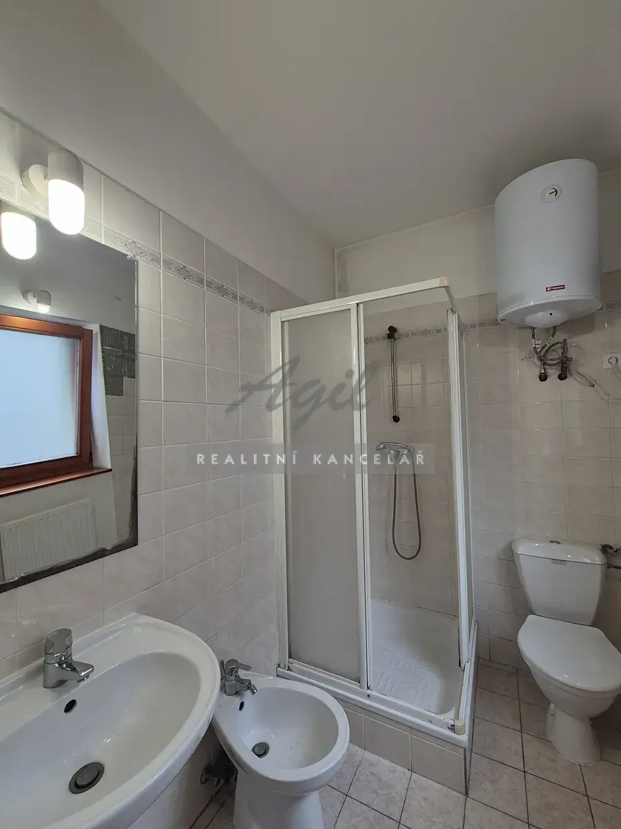 Koupelna s WC dohromady – umyvadlo, sprchový kout, přípojka na pračku, bidet a WC.