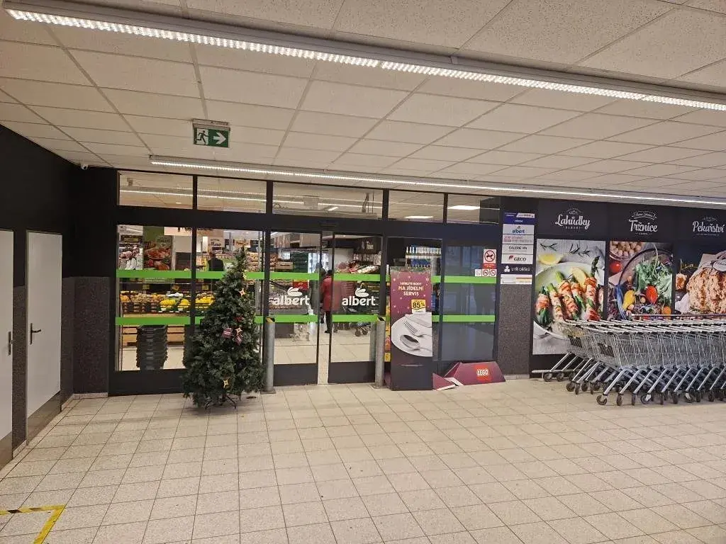 1.NP – bezbariérový přístup, vstupní chodba, prodejna Albert, výtah do 2.NP, schodiště.